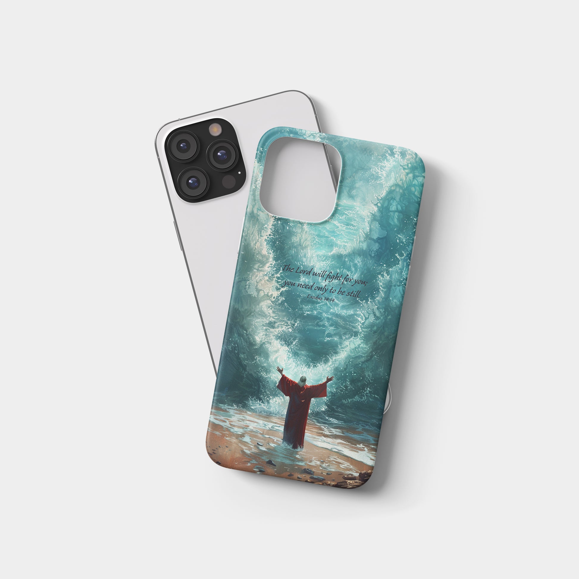 Moody teal-blue waves towering as Moses stands on dry ground, captioned “The LORD will fight for you.” (Exodus 14 : 14).
