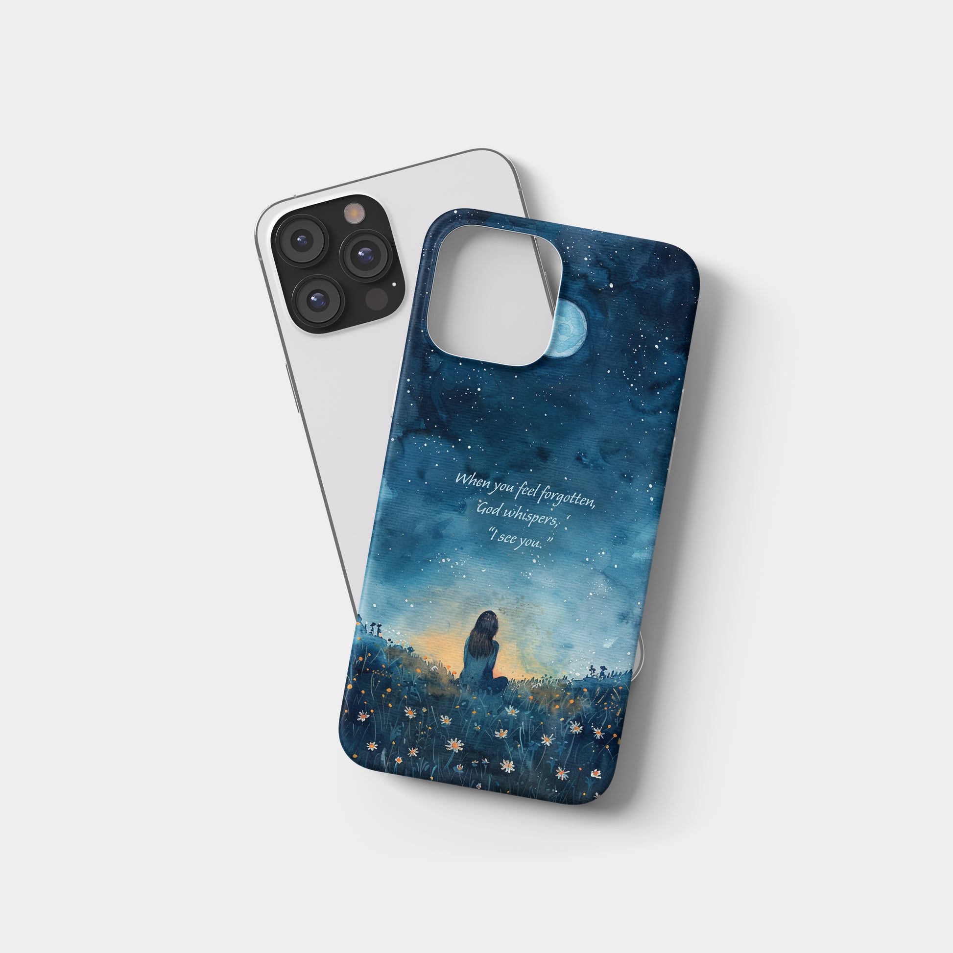 A star‑lit navy sky with a gentle moon watches over a girl seated in a meadow of daisies; text reads "When you feel forgotten, God whispers, 'I see you.'"