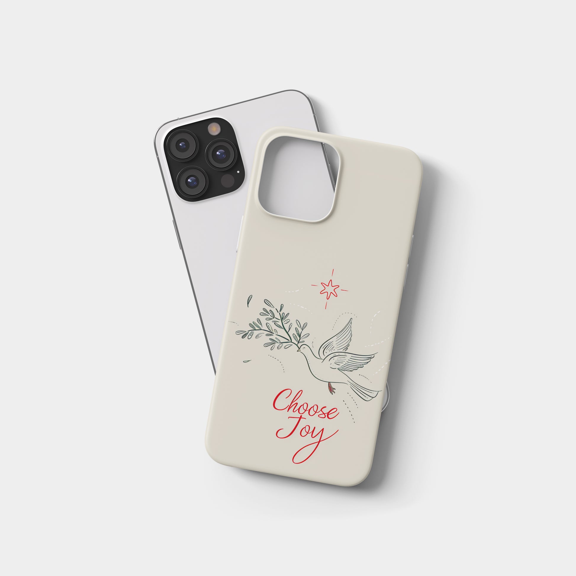 Minimal ivory case featuring a delicate line‑art dove carrying an olive branch with the uplifting phrase "Choose Joy."