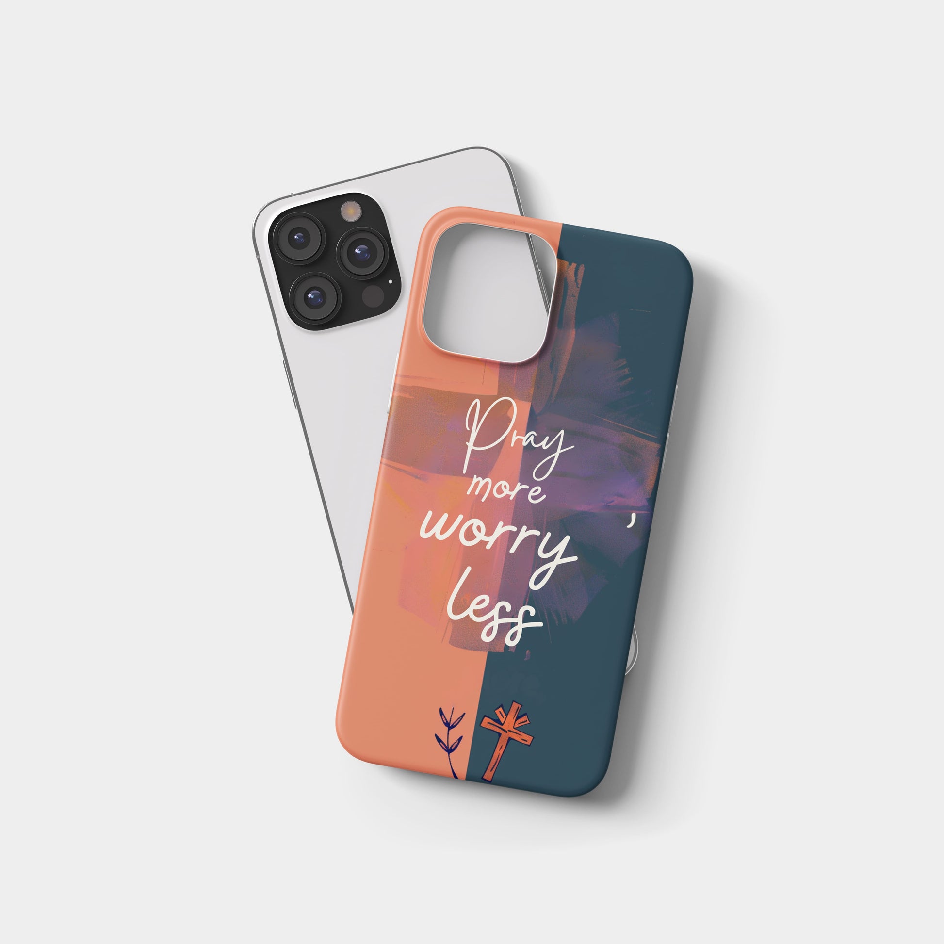 Two‑tone navy and coral brush strokes with a small cross icon and the phrase "Pray more, worry less."